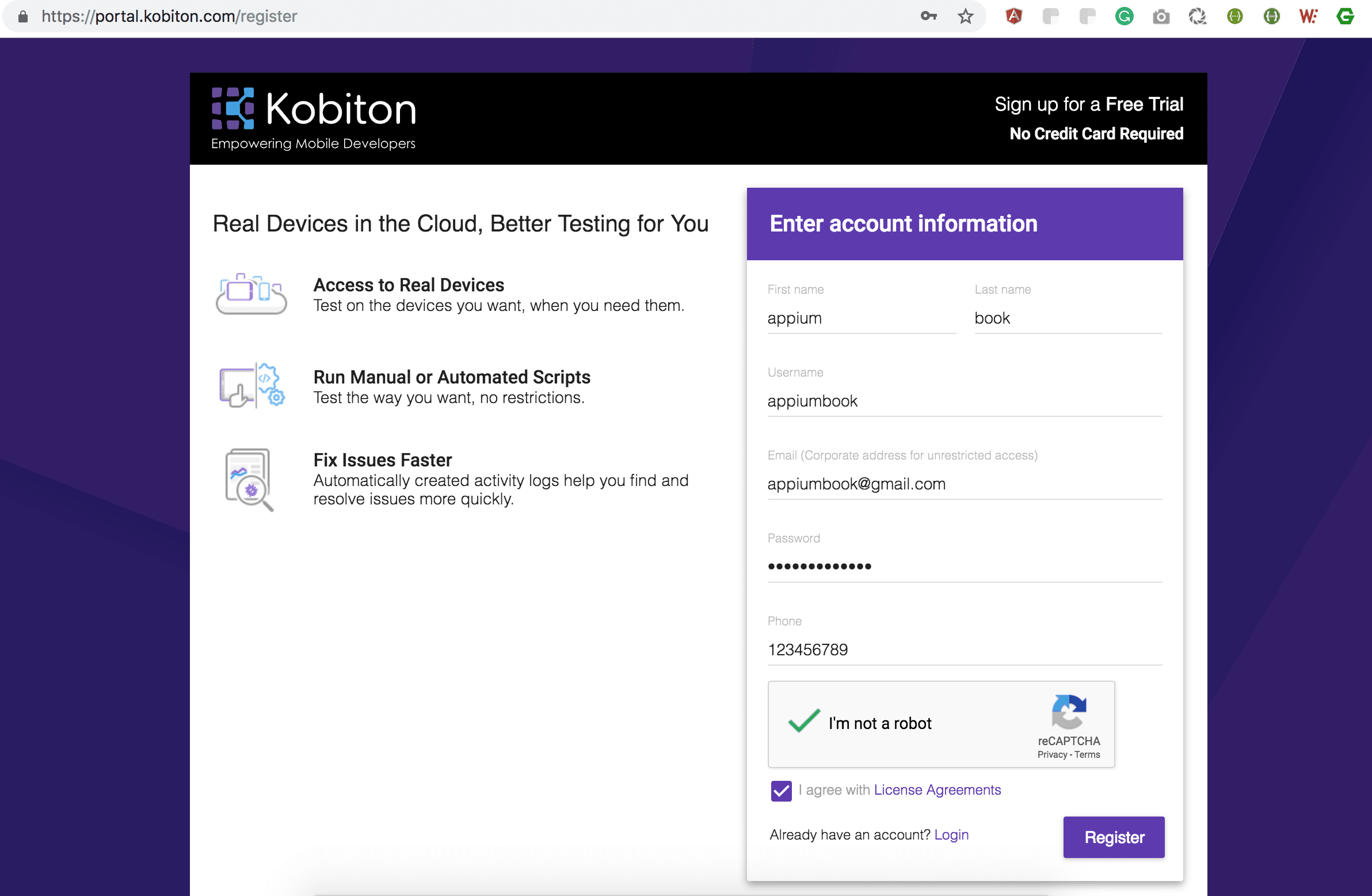 Figure-1: Kobiton Registration Page.
