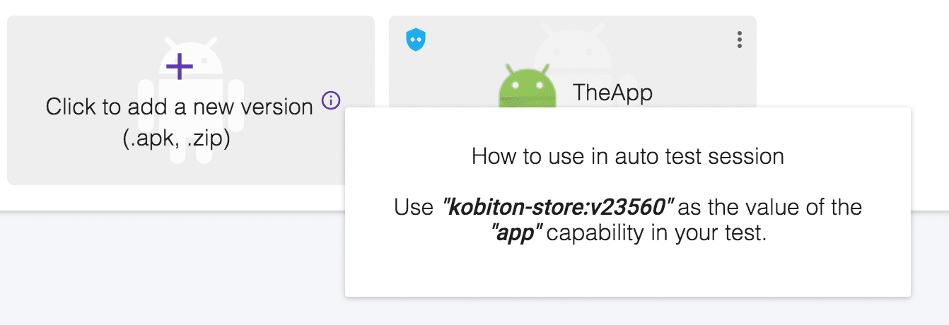 capabilities.setCapability(“app”, “kobiton-store:22304”); Or you can also select the application in the automation settings dialog, so that you don’t need to manually write the app value in desired capabilities.