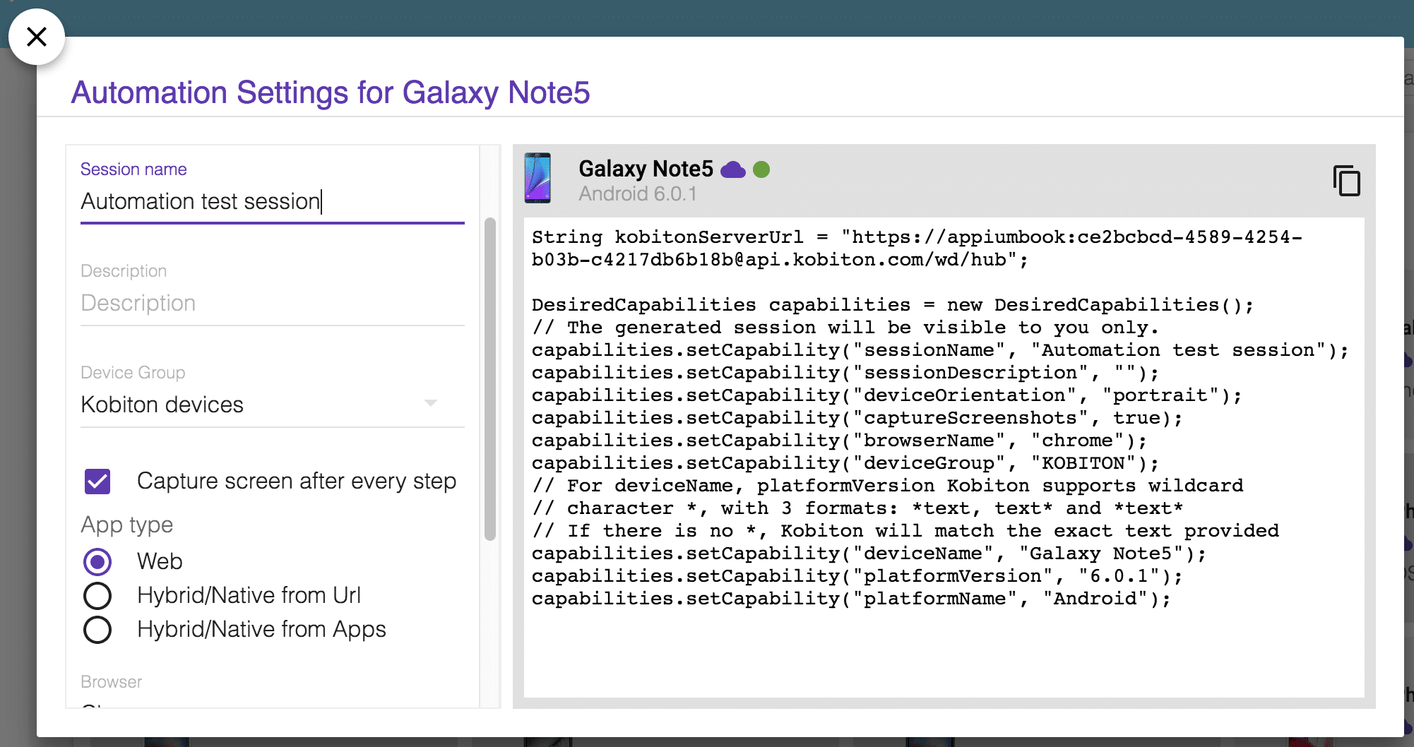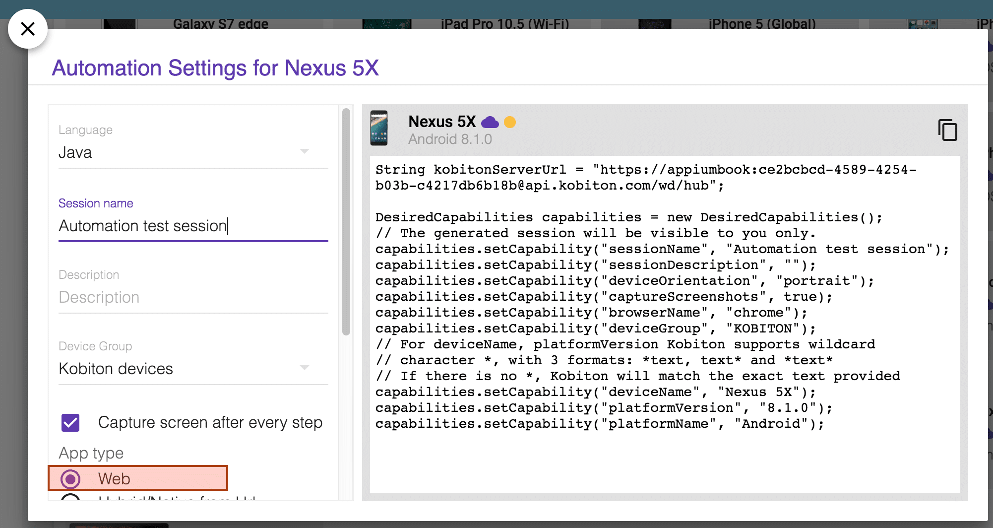 • There is one more thing! What if you want to execute test cases for a mobile browser(chrome/safari) instead of a mobile application? The answer is pretty simple – you just need to select the ”Web” option in the Automation settings for the device and simply copy the desired capabilities. And because we’re testing a web application in this case, there is no need to upload an app.