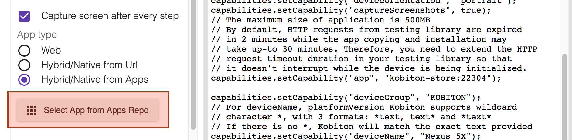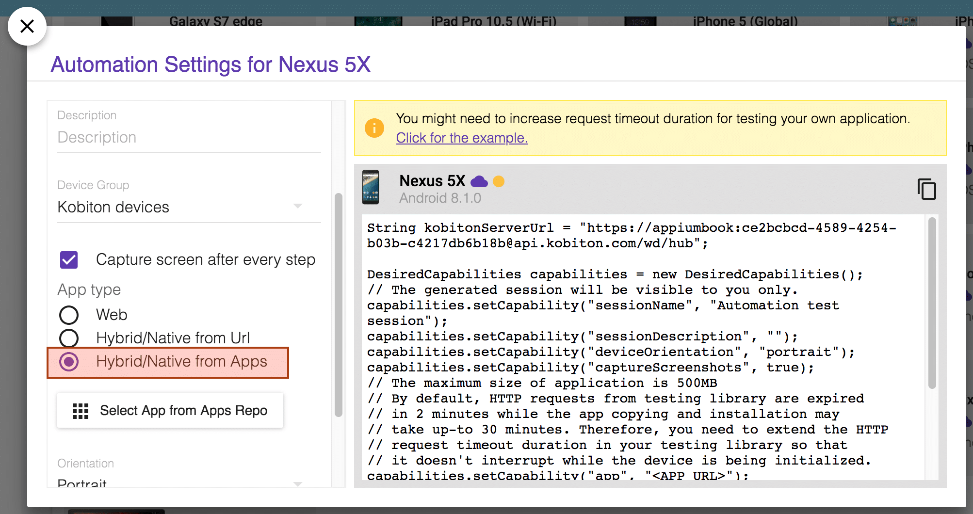 1. After noting down the app value you can move to the Devices section and in the automation settings you will get the set of the Desired Capabilities (for every programming language) which you need to use in order to execute the test case on Kobiton device.