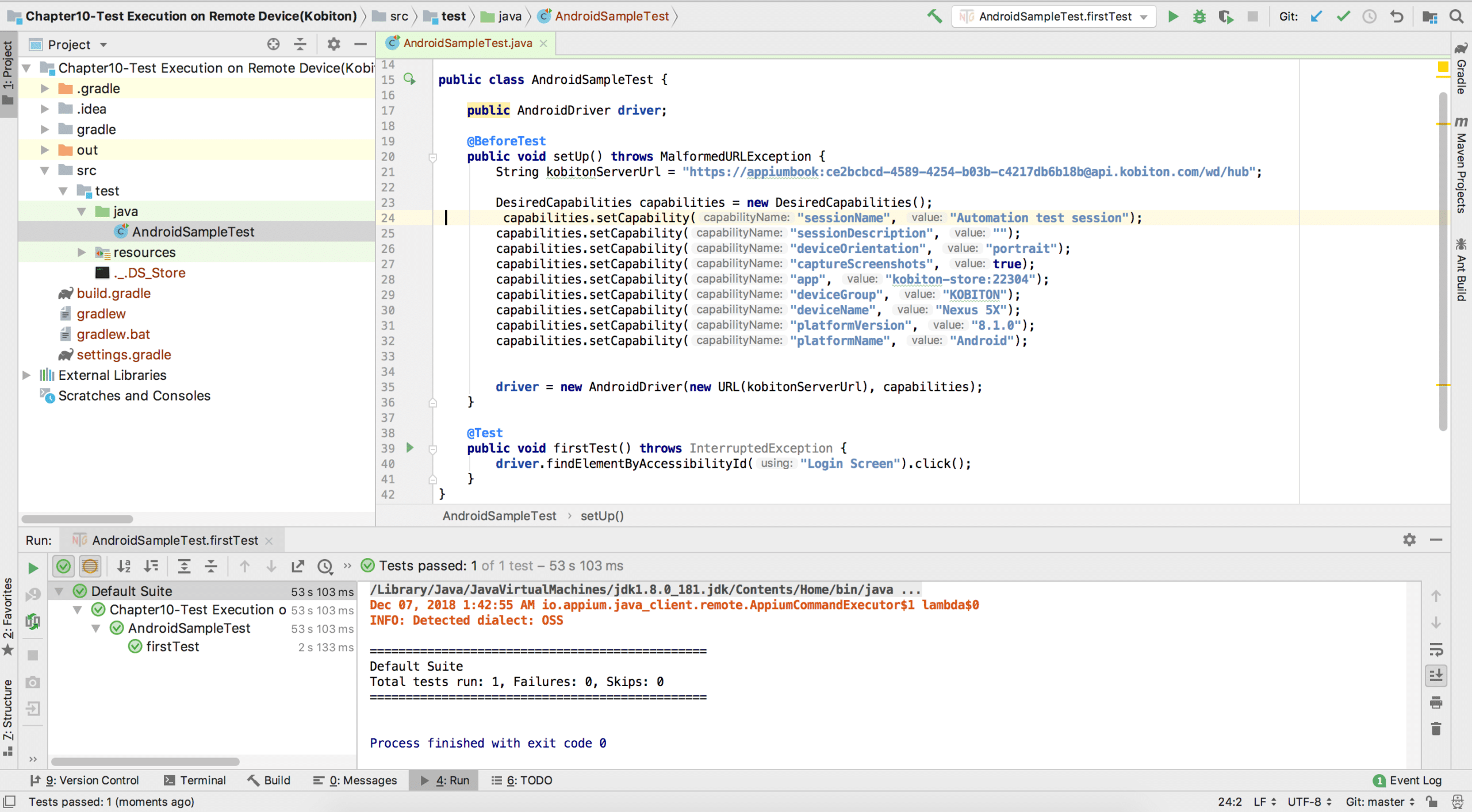 Figure-24: Execution Logs.It’s that easy!You can find the above test code here: https://github.com/appiumbook/appiumbook/tree/master/Chapter10-Test%20Execution%20on%20Remote%20Device-Kobiton