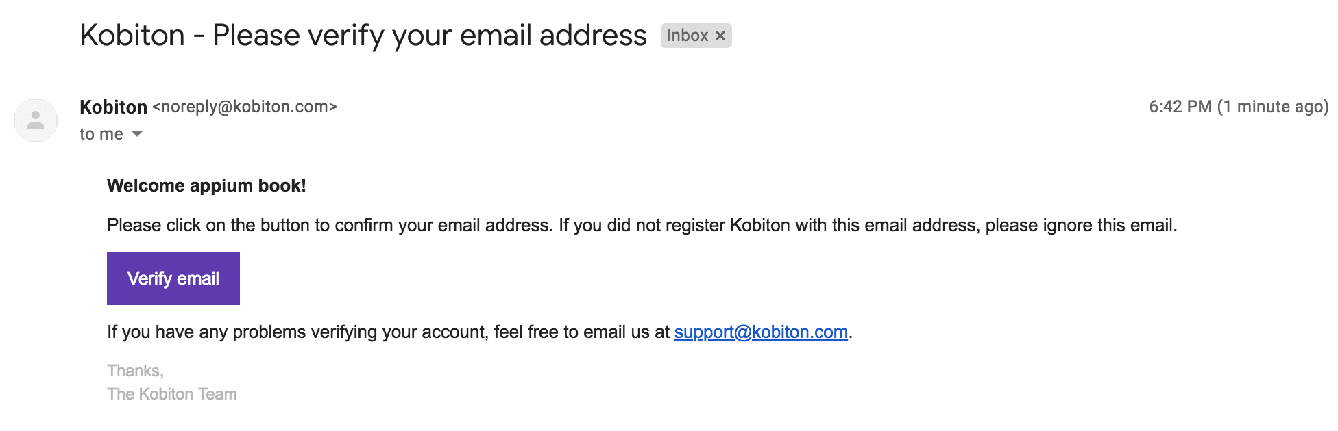 Figure-2: Kobiton Confirmation Email.