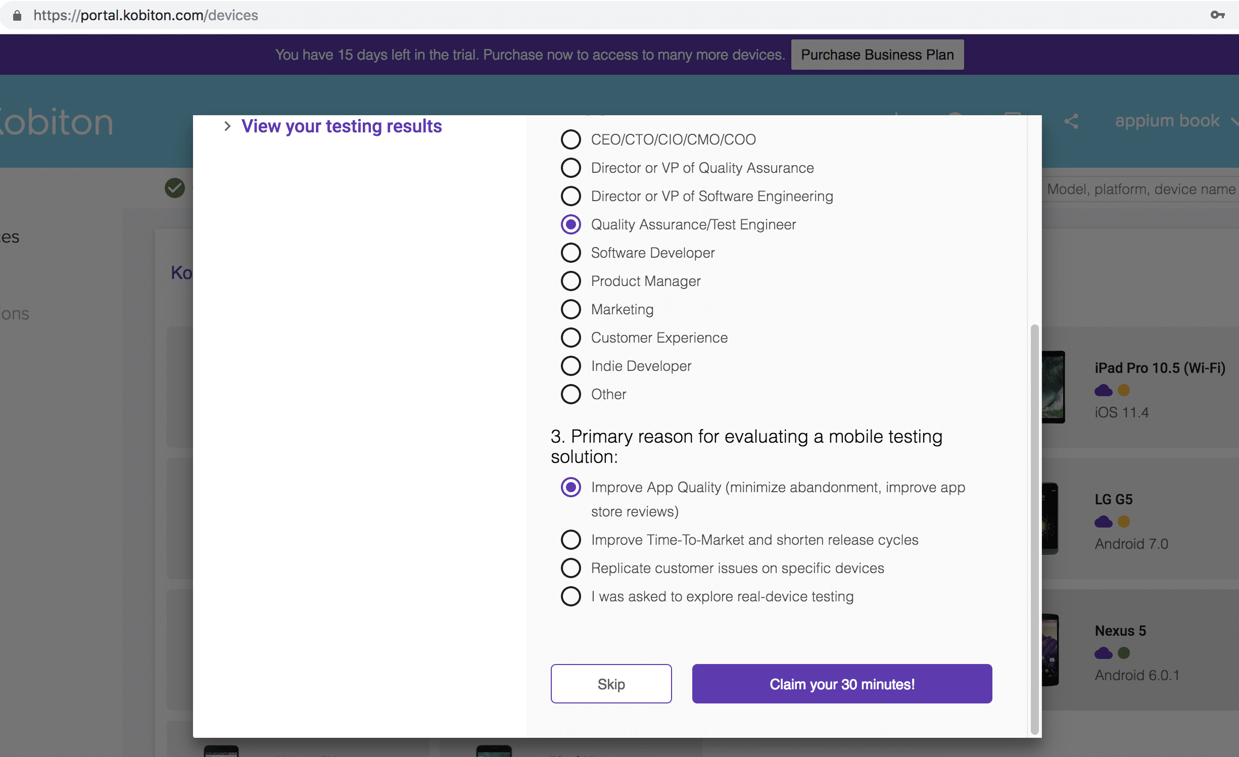1. As part of the free trial, you get 120 minutes. By completing the survey you can get an additional 30 minutes of testing.