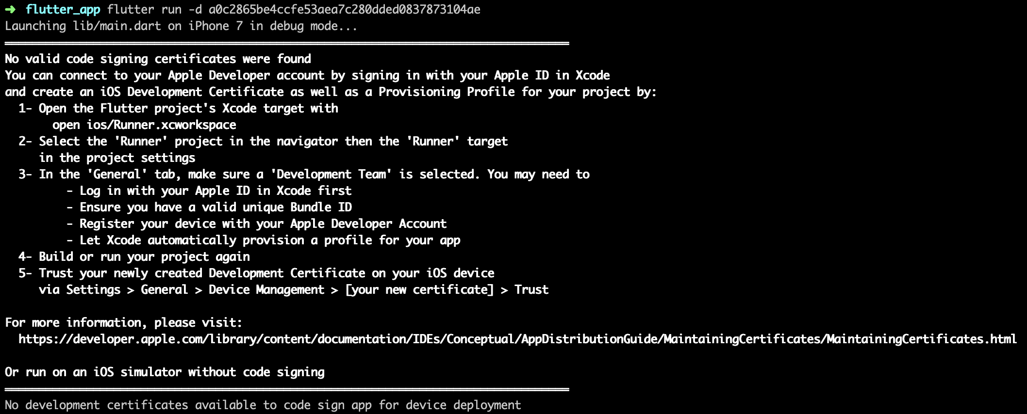 To deploy your Flutter app to a physical iOS device, you’ll need some additional tools and an Apple account. You’ll also need to set up physical device deployment in Xcode.