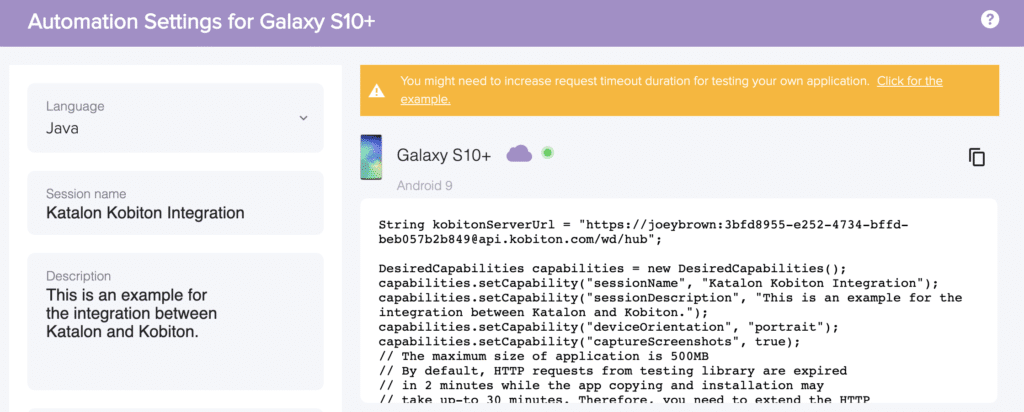 capabilities.setCapability("sessionName", "Katalon Kobiton Integration");